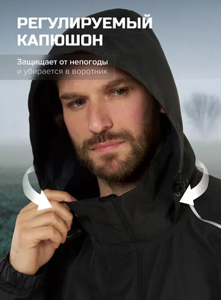 - Капюшон регулируется спереди и при необходимости убирается в воротник.