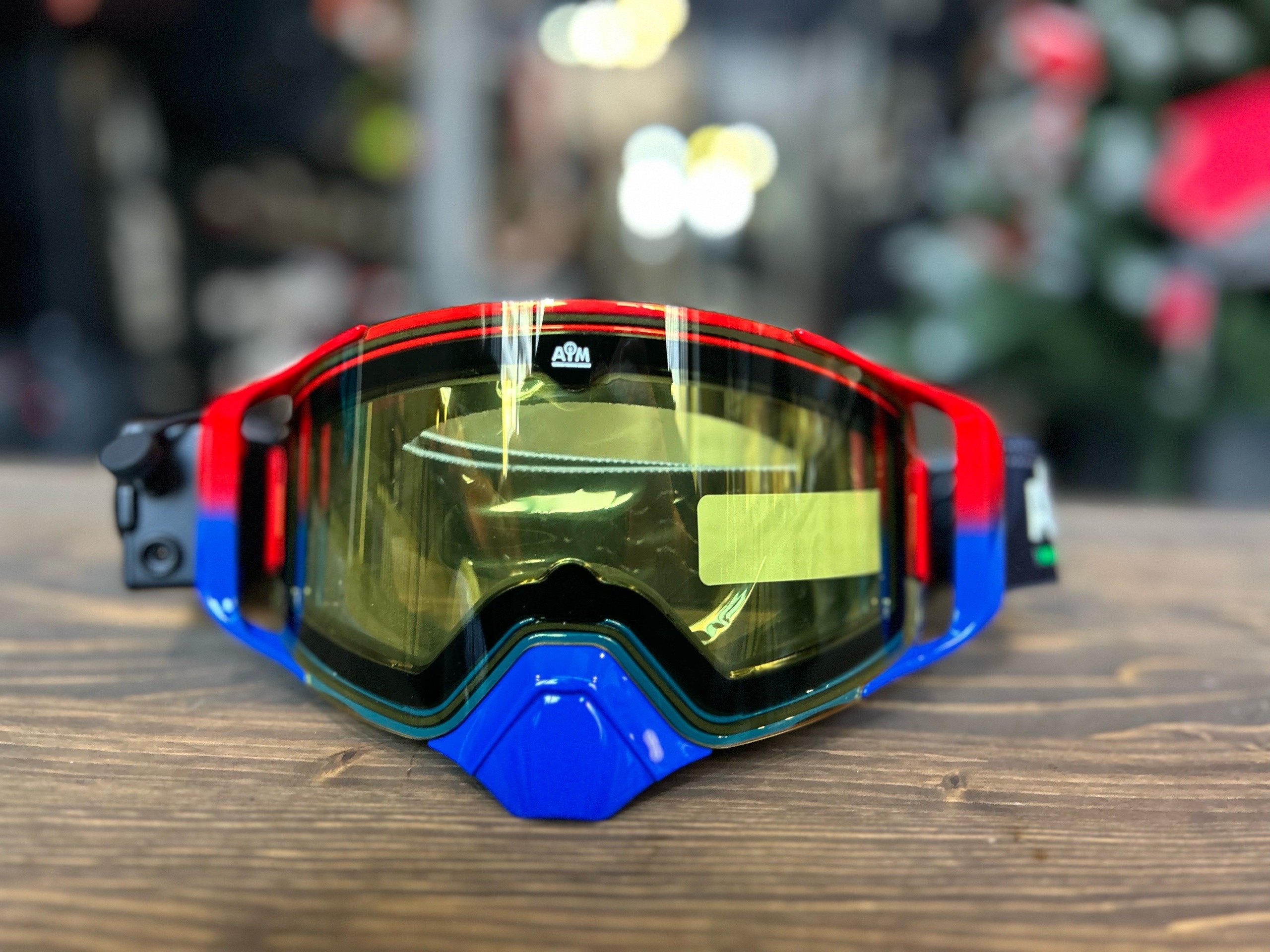 - Ремешок с силиконовым противоскользящим покрытием (три линии) и логотипом AIM надёжно фиксирует очки на голове.