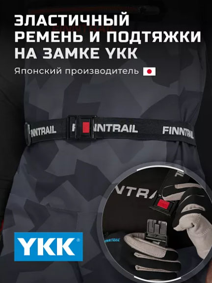 - Эластичные подтяжки и ремень с логотипами FINNTRAIL на замке YKK позволяют отрегулировать посадку по фигуре.